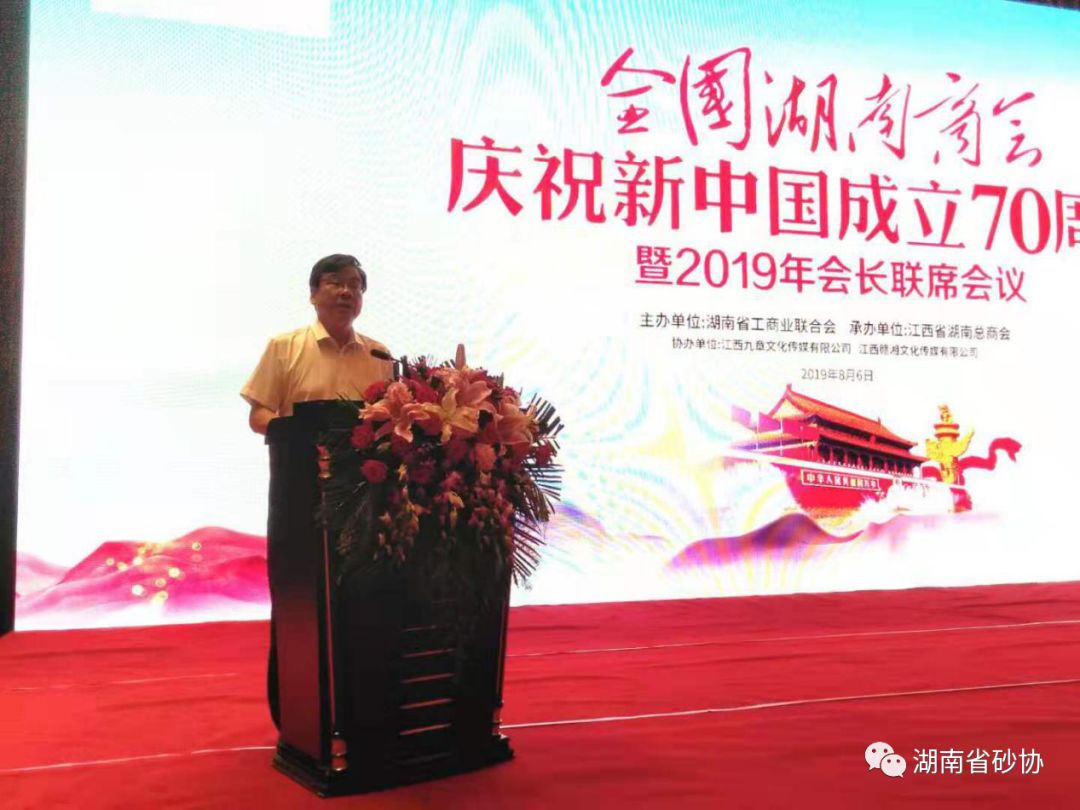 為慶祝新中國成立 70 周年,凝聚湘商力量,弘揚湘商精神,促進各地商會交流合作,全國湖南商會慶祝新中國成立 70 周年暨 2019 年會長聯席會議于 8 月 5 日至 6 日在南昌召開,此次會議由湖南省工商業聯合會主辦,江西省湖南總商會承辦,湖南省砂石協會會長李建科應邀出席并作為湘商代表發言。