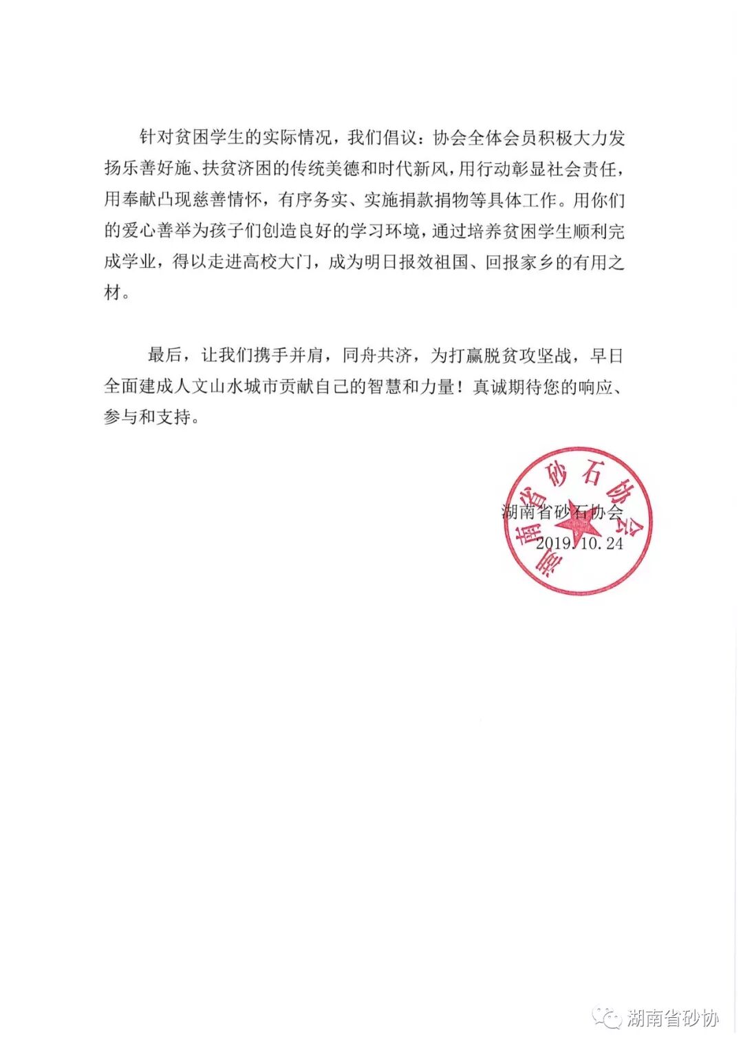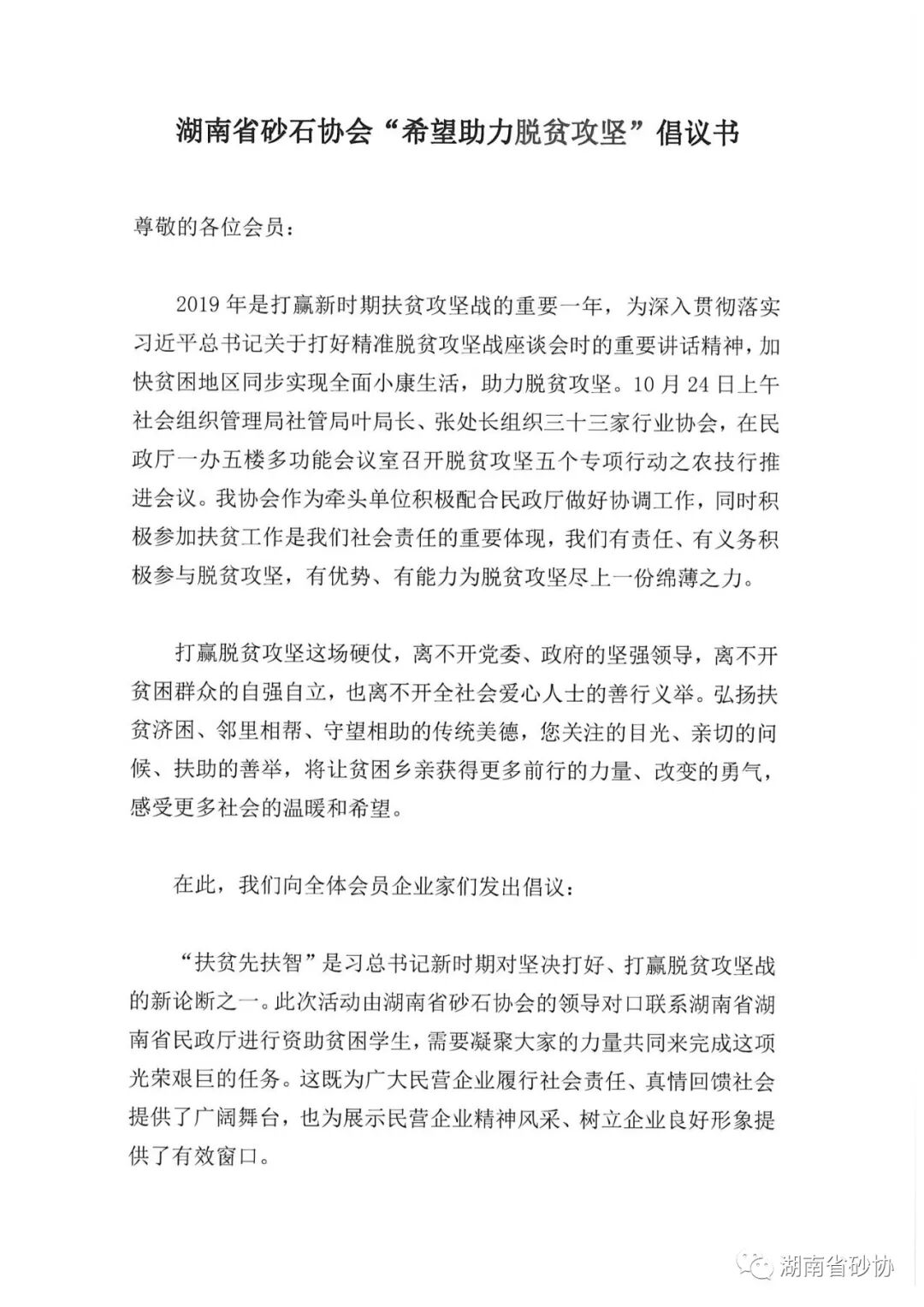 湖南省砂石協會“希望助力脫貧攻堅”倡議書