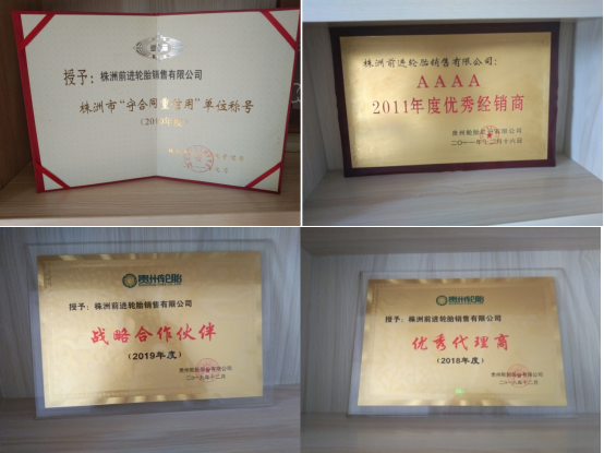 ▲ 公司多次獲得湖南省優秀經銷商、貴州輪胎戰略合作伙伴、米其林優秀代理商、回力優秀代理商等獎項。