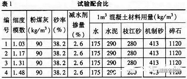 選用的機(jī)制砂的細(xì)度模數(shù)為2.78,枝江砂選用了細(xì)度模數(shù)分別為1.03、1.17、1.31、1.48的四種。