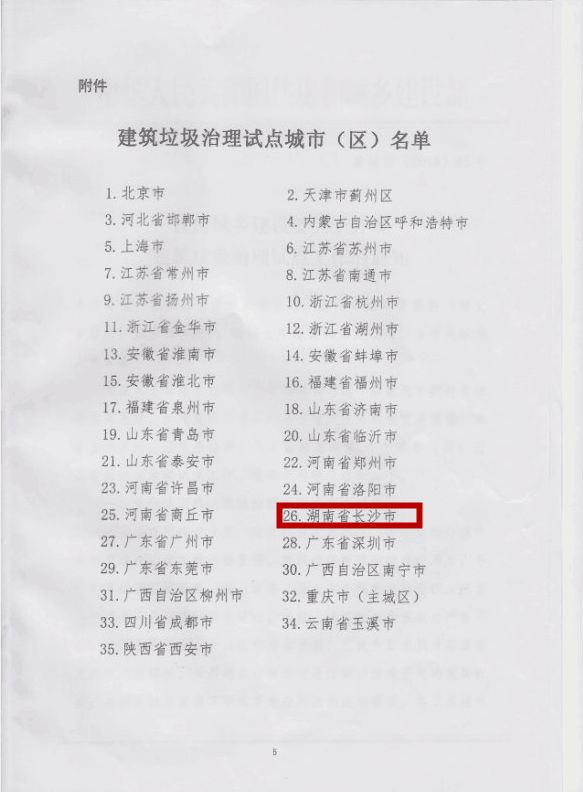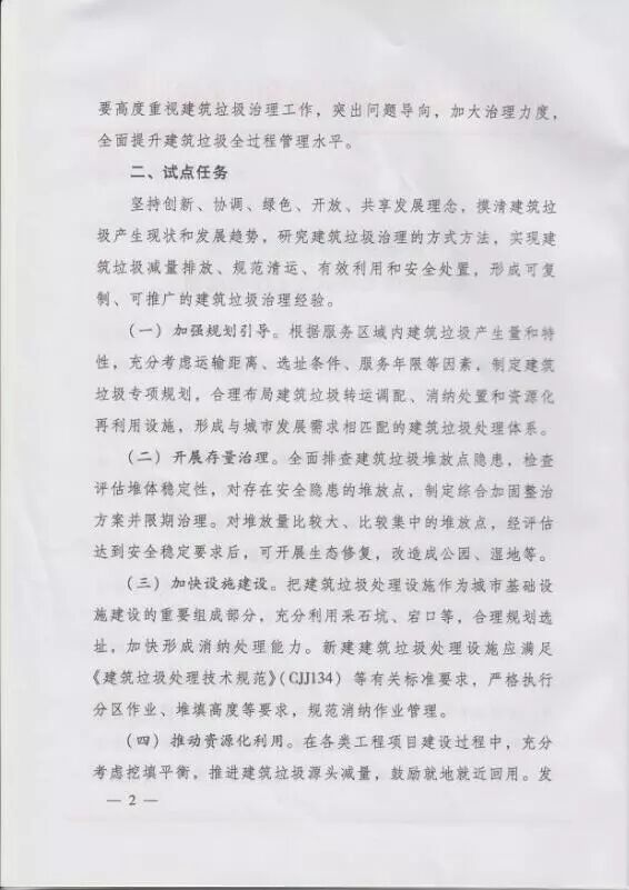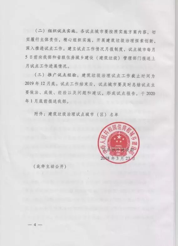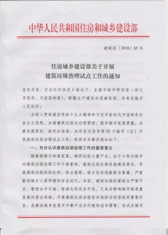 通知 | 住房和城鄉建設部印發《關于開展建筑垃圾治理試點工作的通知》 發布日期:2018-04-13 07:02:02 點擊量:1 標簽:通知公告 近日,為深入貫徹落實黨的十九大精神和習近平新時代中國特色社會主義思想,加強建筑垃圾全過程管理,提升城市發展質量,住房和城鄉建設部印發《關于開展建筑垃圾治理試點工作的通知》(建城函〔2018〕65號),決定在北京市等35個城市(區)開展建筑垃圾治理試點工作。(來源:中華人民共和國住房和城鄉建設部)